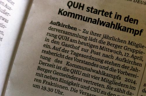 Auf dem Programm stehen neben obligatorischen Angelegenheiten wie dem Bericht des Vorstandes vor allem die Vorbereitungen auf die Kommunalwahl in nächsten Frühling. Wie soll die Liste der QUH aussehen? Wie kann man wieder stärkste Fraktion werden? Wer soll, möchte oder muss für den Gemeinderat kandidieren? – Gibt es – wie beim letzten Mal bereits – wieder eine Frauenquote (50:50)? Bei der Presse sieht es fast so aus, als freue sie sich darauf, dass dann wieder etwas los ist: