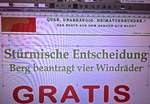 Die Vorbereitungen laufen auf Hochtouren … auch diese Woche haben wir wieder versucht, unsere kleine lokalpolitische Zeitung für sie herauszubringen: natürlich in der 6. Ausgabe von DAS BERGER BLATT ganz aktuell: die “geheime” Entscheidung des Berger Gemeinderates – Seehofer zum Trotz – vier Windräder zu beantragen. Außerdem: eine Vorstellung der Berger Kindertagesstätten, der dritte Teil des QUH-Manifestes und ein glückliches Geburtstagskind.
