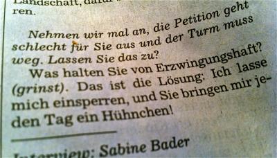 Wir erfahren, dass Herr Genz Schwarzbauten “nicht einfach in der Landschaft”, sondern auf seinem eigenen Grund baut, und dass der Mürserturm kurz davor stehe, “zum Weltkulturerbe erklärt zu werden.” In einer Passage geht das lockere Gespräch auch auf das einstmals angespannte Verhältnis zwischen QUH und dem Unternehmer ein: