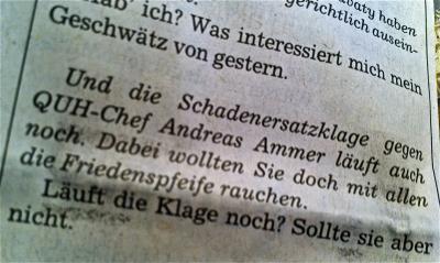 Dazu ist zu sagen, dass der QUH-Anwalt Dr. Rehbock uns mit Schreiben vom 24.3. mitgeteilt hat, dass eine Nachfrage bei Gericht ergeben habe, “dass die Gegenseite keinen Schriftsatz eingereicht hat, wonach Herr RA Veauthier Herrn Dr. Genz nicht mehr vertritt. Es bleibt also bei dem Entscheidungsverkündigungstermin 27.04.2011” – Es geht bekanntlich um eine Schadensersatzklage von “mindestens 30.000€”. – Trotzdem haben wir uns heute köstlich amüsiert.