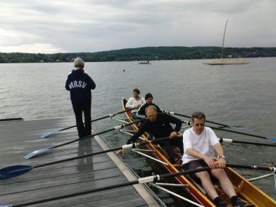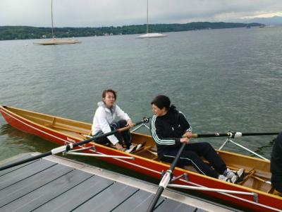 Pech mit dem Wetter – um den Starnberger Megastau zu vermeiden, fuhr GR Andi Gastl-Pischetsrieder (links) Peter Sewald (rechts) und Elke Link (ebenfalls patschnass) mit dem Fischerboot zum Training und im strömenden Regen wieder zurück, wo sie gleichzeitig mit Peter Gauweilers Geburtstagsdampfer anlegten.