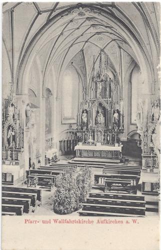 Sie setzt der Landschaft sozusagen die Krone auf, die weithin sichtbare Wallfahrtskirche Maria Himmelfahrt in Aufkirchen. Erste historische Erwähnungen einer Kirche an dieser exponierten Stelle stammen aus dem 10. Jahrhundert. Das Gotteshaus wie wir es heute kennen, wurde 1500 eingeweiht. Klar, dass seither so manche Renovierung notwendig war, die auch im Inneren der Kirche ihre Spuren hinterließ. Bei einem Brand im Jahre 1625 wurde der Überlieferung zufolge beinahe das gesamte Inventar vernichtet. 1963 entdeckte man bei Renovierungsarbeiten zwei Freskos, die aus dieser Zeit datieren. Bis 1888 schmückte ein barocker Hochaltar den Innenraum. Fotos oder Abbildungen sind nicht erhalten, wohl aber die Figuren der hl. Katharina und Barbara, die seit 1888 in der Filialkirche Farchach ihr neues Domizil haben. In diesem Jahr wurde die Wallfahrtskirche umfangreich renoviert und erhielt einen neugotischen Altar. In seiner Mitte war das heute noch erhaltene Gnadenbild der Mutter Gottes integriert.