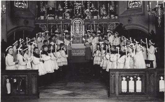 Wer hier die hl. Erstkommunion feiert, wissen wir nicht genau, fest steht, es war vor 1961. Das heißt einige der Kommunionkinder leben durchaus heute noch in der Gemeinde, ob ihnen das aktuelle Erscheinungsbild der Kirche besser gefällt?