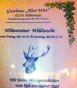 Ganz wild geht es natürlich in Höhenrain zu, wo diese Woche Wild vom Reh aus ‘”eigener Jagd” auf die bekannt bayerische Art vorzüglichst zubereitet wird. Reservierungen unter: 08171-18172 .