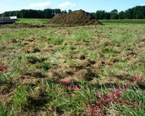 Hier wird ausgehoben: Die neuen “Ecken” der Kunstrasenanlage wurden schon einmal auf das alte Gras gemalt