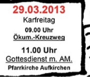 Für die katholische Kirche ist der Karfreitag ein strenger Fastentag. Am Ostersonntag wird um 5:30 in der Kirche Mariä Himmelfahrt in Aufkirchen die Osternacht mit Speisensegnung gefeiert, mit anschließendem Osterfrühstück im Pfarrsaal.