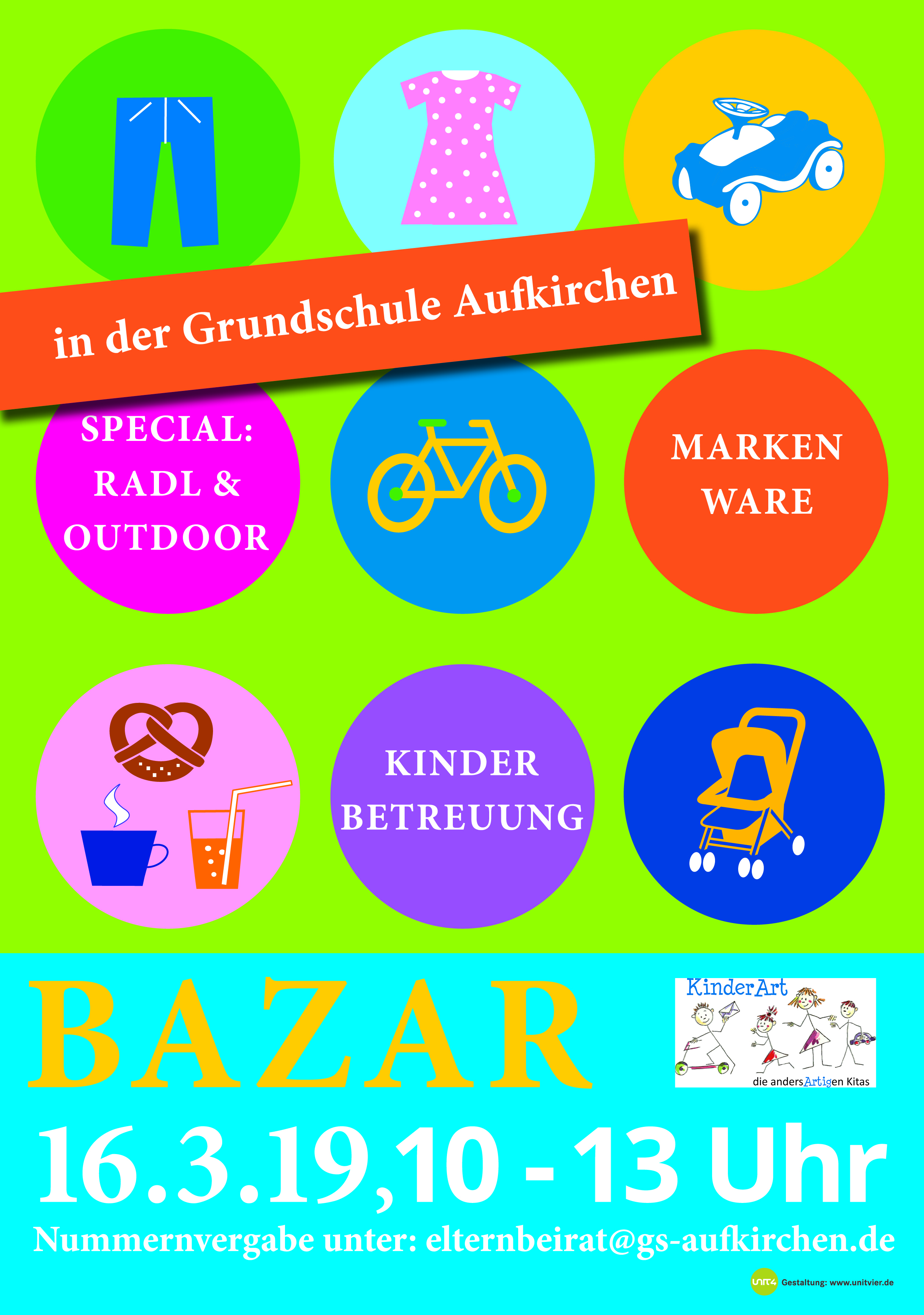 Zwischen zehn und dreizehn Uhr wird Aufkirchen wieder lahmgelegt – bei dem beliebten Bazar in der Grundschule herrscht immer großer Andrang. Das Bazar-Team der Oskar-Maria-Graf-Grundschule und der KinderArt Tagesstätten in Berg und Höhenrain verkauft Frühlings-und Sommerbekleidung bis Gr. 164, Spielzeug, Kindersitze, Kinderwägen, Babyausstattung und vieles mehr. Im großen Outdoor Bereich findet man Rollerblades, Fahrräder, Dirtbikes, Traktoren und vieles mehr. Für das leibliche Wohl ist gesorgt, Kinderbetreuung gibt es auch. Schwangere mit Mutterpass können bereits um 9.30 Uhr zum Einkaufen kommen.