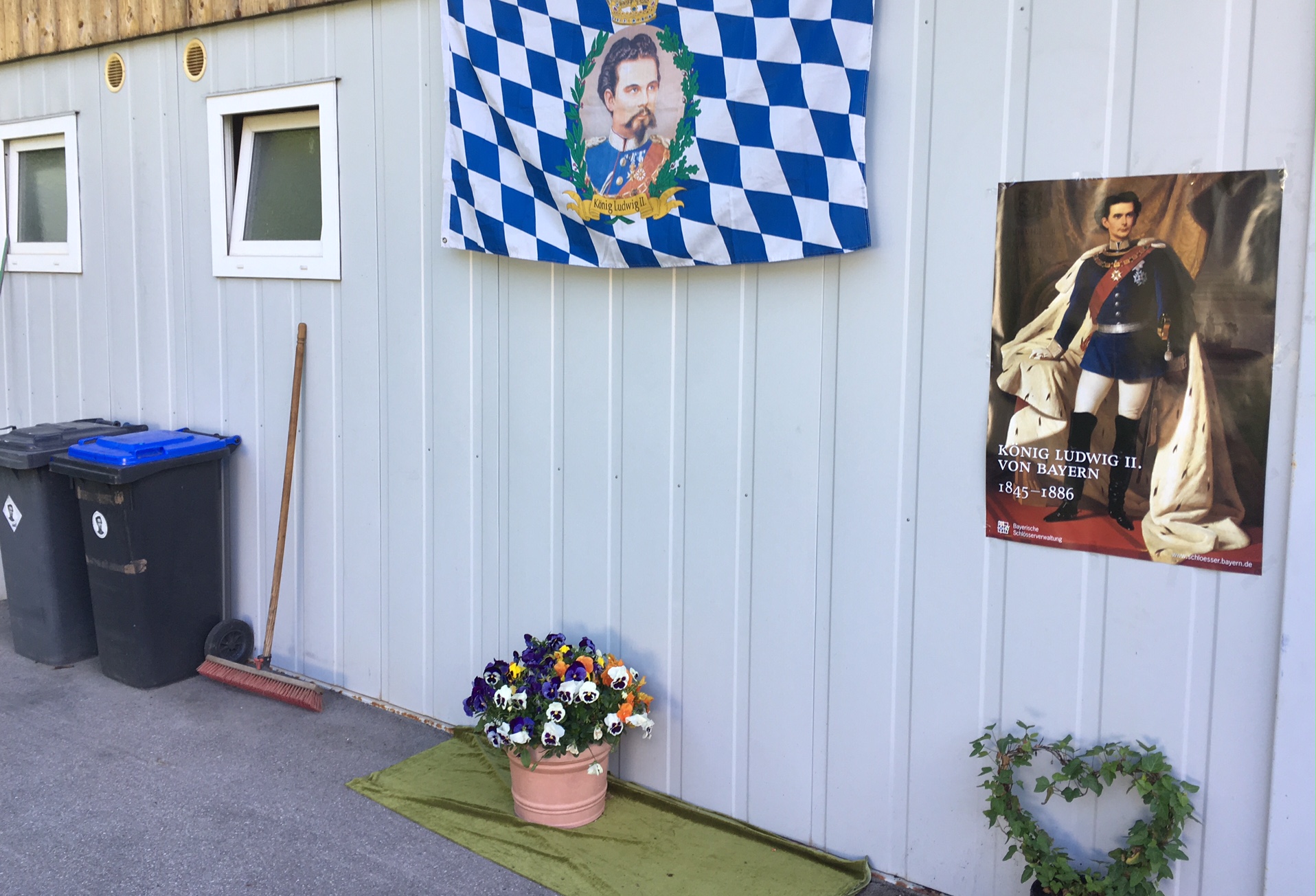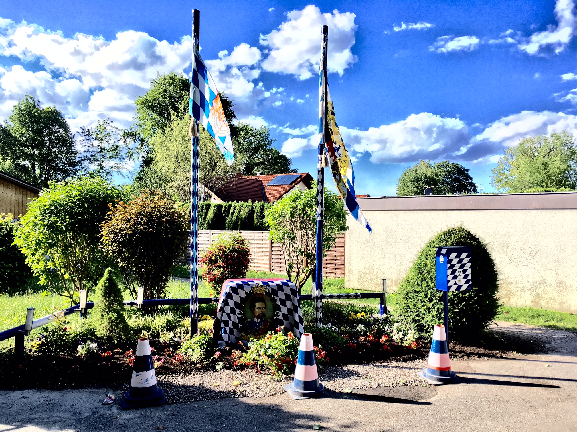 Briefkasten, Straßenabsperrung, Flaggen und ein Schrein für Ludwig II. eine private Installation neben dem Marstall