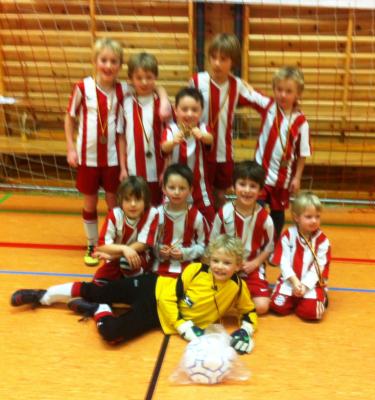 Gelegentlich kann auch die Laune von 7-jährigen Kickern so mies sein wie das Wetter an diesem Sonntag. Bester Laune trotz miesen Wetters waren gestern die Jungs der Berger F2. Beim Landkreis-Cup in Geretsried erspielten sie sich verdient den 1. Platz und beendeten damit höchst erfolgreich die diesjährige Hallenturnier-Saison.