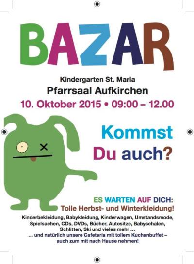 Heute – zwischen 9:00 und 12:00 Uhr – findet wieder der traditionelle Herbst- und Winterbazar des Kindergartens St. Maria im Pfarrsaal Aufkirchen statt – mit allem, was das Kind so braucht. Und außerdem lockt wieder das üppige Kuchenbüffet!
