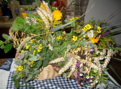 Für Unwissende hier Reginas Erklärung dazu: Am Maria Himmelfahrtstag wird der Kräuterbuschen in der Kirche geweiht. Deshalb sammeln wir immer einen Tag vorher Kräuter wie Pfefferminz, Johanniskraut, Scharfgabe und Ringelblumen. Diese werden zusammen mit einer Königskerze zu einem Strauß gebunden. Man stellt diesen dann in die Stube. Er soll Schutz und Segen bringen und geht auf die Legende zurück, dass die Jünger nach dem Tode Marias nicht ihren Leichnam, sondern Kräuter im Grab vorfanden. Wenn man also unterm Jahr besonderen Schutz benötigt, z.B. wg. eines Unwetters, kann man ein bisschen vom Kräuterbuschen abreißen und in den Ofen zum Verbrennen werfen. Andernorts binden die Frauen auch Blumen, wie Sonnenblumen und Phlox in den Buschen. Das kann man machen wie man will – der Wille zur Tradition zählt!