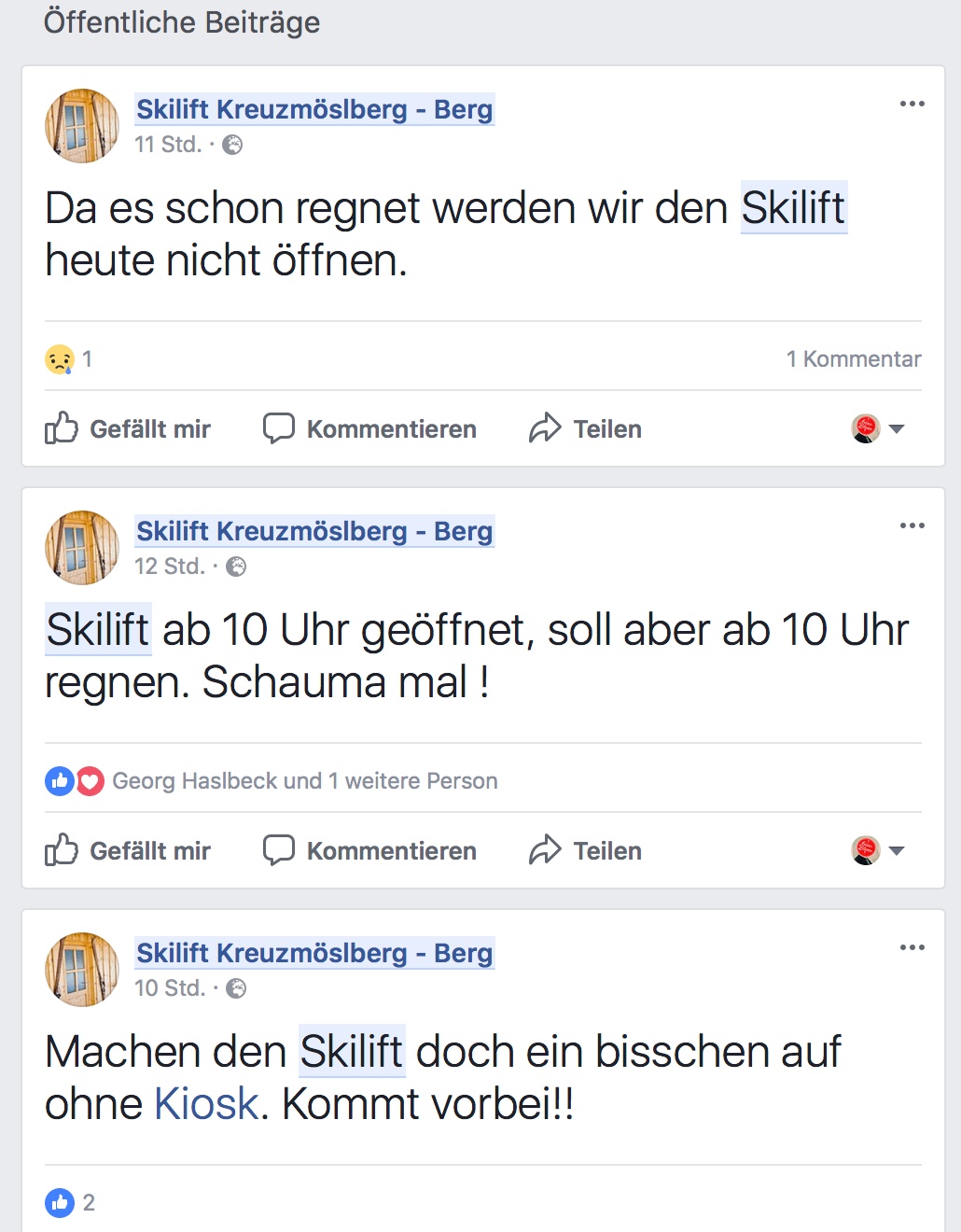 Für alle, die tagtäglich vor diese Frage gestellt sind, hat Robert Schmid, der tapfere Betreiber des Berger Skiliftes, eine facebook-Seite eingerichtet, auf der man sich täglich und aktuell darüber informieren kann, ob die Pistenverhältnisse im besten, steilsten, geilsten, größten und preisgünstigsten Skigebiet des ganzen Landkreises für einen Betrieb ausreichend sind (geöffnet ist normalerweise ab 13 Uhr und an Wochenenden): https://www.facebook.com/skilift.kreuzmoeslberg/ . Heute beispielsweise ging es wegen der Wetterkapriolen hin und her: Ganz früh hieß es, der Lift sei geöffnet, eine Stunde später wurde er wegen Regen geschlossen, dann ohne Kiosk geöffnet und dann doch geschlossen)