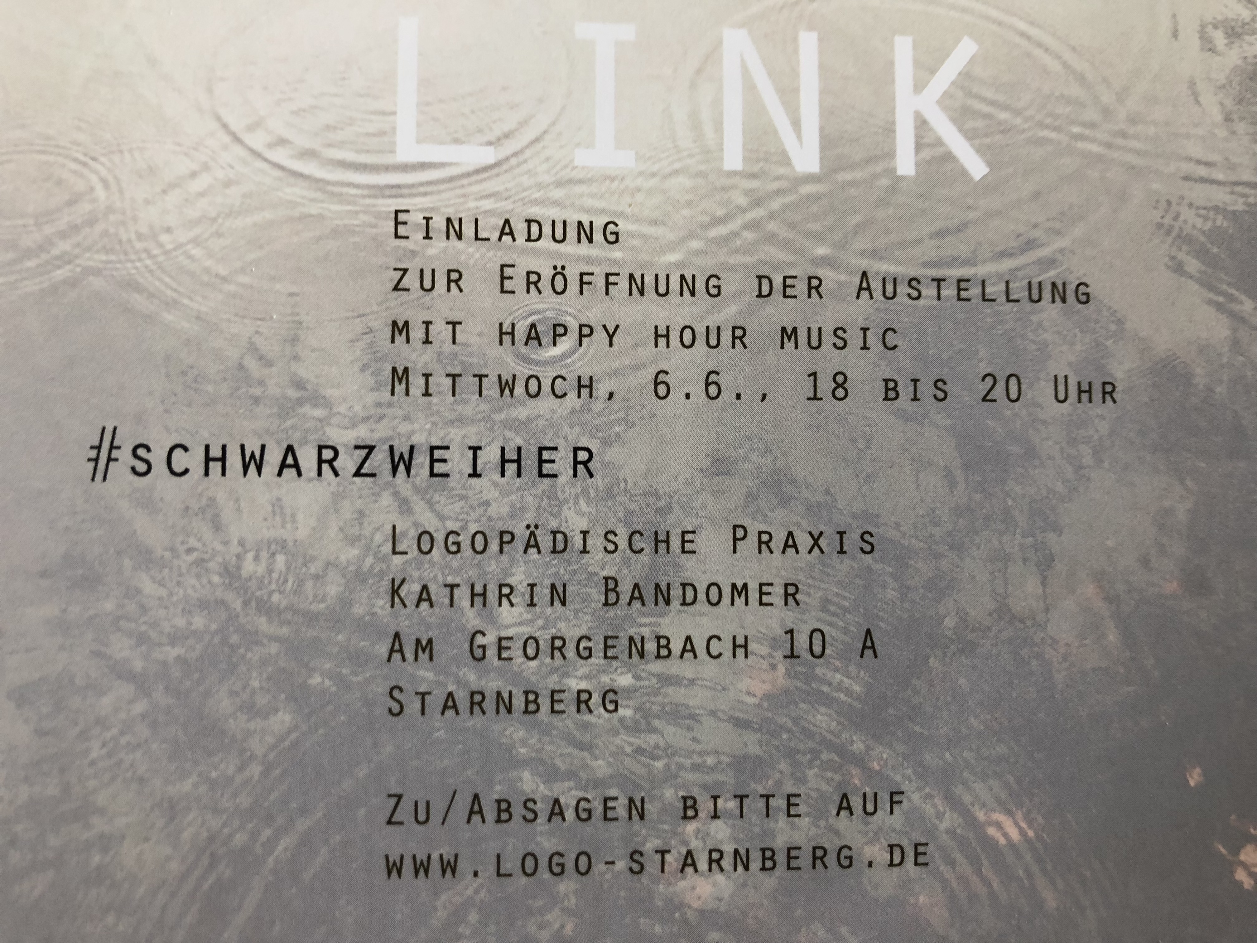 Und wer noch einmal den schwarzen Weiher in Allmannshausen mit den Augen von Elke Link sehen möchte, kann am Mittwoch, den 6.6., zur Ausstellungseröffnung in die Logopädische Praxis von Kathrin Bandomer, Am Georgenbach 10 A, in Starnberg – mit kleinem Gärtchen – kommen. Von 18 bis 20 Uhr gibt es ein Gläschen zu trinken und Jazzstandards von drei Musikern von Justyn Tyme.