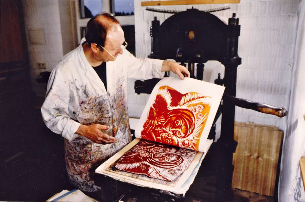 Walter Habdank ist nicht nur der Vater eines Pfarrers, sondern war selbst Sohn eines Diakons. Lange konnte er von seiner Kunst nicht leben, erst als er seinen expressionistischen Ansatz mit der christlichen Ader seiner Familie auch in seinem Werk Platz ließ, wurde er als Schöpfer von Holzschnitten mit oft religiösen Hintergrund bekannt. Seit 1979 bis zu seinem Tod 2001 lebte und schaffte Walter Habdank in Berg. Mehr zu seinem Werk, insbesondere viele seiner Holzschnitte finden Sie hier:
