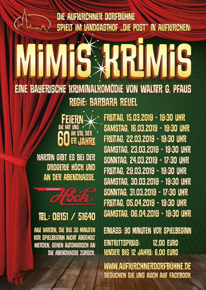 Immer ein besonderes Schmankerl: die Aufführungen der Aufkirchner Dorfbühne. Am Freitag, den 15. März, ist Premiere im Landgasthof Die Post in Aufkirchen. Die Freitags- und Samstagsvorstellungen von “Mimis Krimis” unter der Regie von Barbara Reuel beginnen jeweils um 19:30 Uhr, die beiden Sonntagsvorstellungen um 17:30 Uhr. Mit 12 € sind Sie dabei, Karten gibt es in der Drogerie Höck und an der Abendkasse. Wir wünschen schon mal toi, toi, toi!