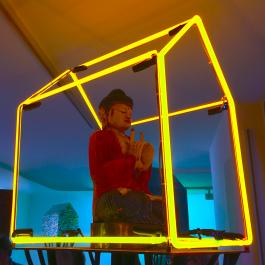 Nein, man denkt – wohnt man außerhalb von Berg – angesichts der Krisen in Vorderasien nicht unbedingt an Kunst, wenn man das Wort “Iran” hört. Innerhalb von Berg aber hat es sich die Haleh Gallery seit Jahren zur Aufgabe gemacht, von unserem Dorf aus einen künstlerischen Austausch zwischen den Ländern zu befördern. Denn der Iran, die Wiege der Kultur, besteht durchaus nicht nur aus religiösen und anderen Eiferern. Gerade beweist dies eine höchst “heimatverbundene” Ausstellung des in Wien lebenden Iraners Behruz Heschmat, der in der örtlichen Galerie unter dem Titel “HOME” eine Vielzahl kleiner Häuser unterschiedlichen Inhalts aufgebaut hat. Seitdem wacht über Berg Tag und Nacht sanft und mit inniger Strahlkraft ein neonbehauster Buddha.