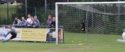 Links der Torwart, in der Mitte die Fans, rechts Rainers weißer Regenschirm und darunter im Flug der Ball: Tooor!