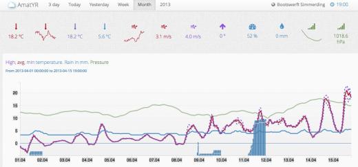 So sehen Frühlingsgefühle als neutrale Grafik aus: Außen- (blau) und Wasser-Temperatur (grün) sowie “Dewpoint” (rot) am unermeßlich schönen 15.4.13