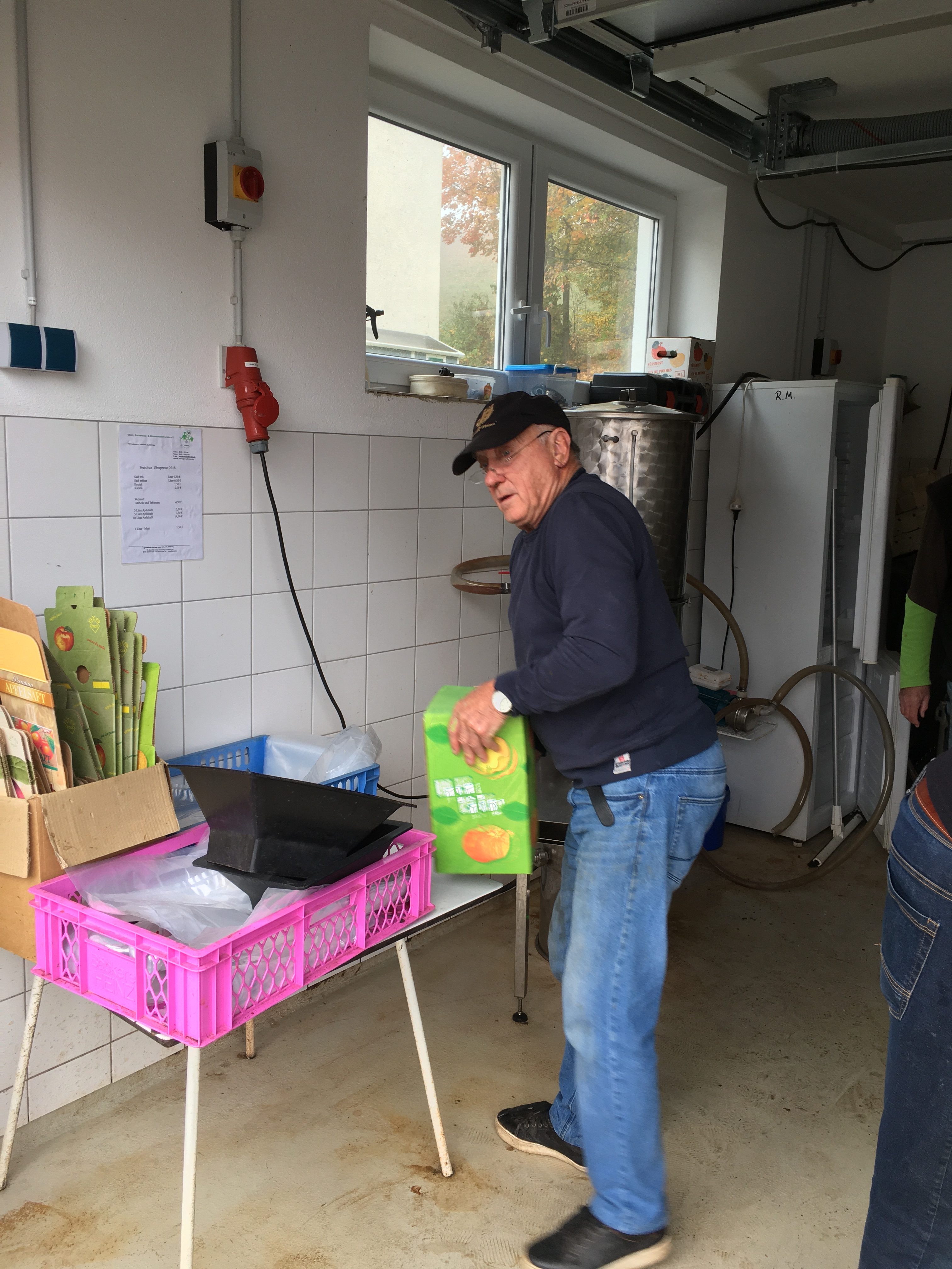 Die Obstpresse ist nun schon elf Jahre in Betrieb – und die Investition von insgesamt 40.000 € für die komplette Anlage hat sich gelohnt, auch wenn in diesem Jahr erst 2500 Liter Saft gepresst wurden – im letzten Jahr waren es 9500 Liter! Die freiwilligen Helfer, meistens zehn bis zwölf an der Zahl, treffen sich jeden Dienstag und Freitag zum Pressen (auch die QUH-Mitglieder Friedrich Jacob und Peter Born sind aktiv dabei). Saft kann aber gekauft werden, das Lager ist voll, sagt Ralf Maier. 5 Liter heimischen Apfelsaft gibt es für 7,50 €, 10 Liter kosten 14 €.