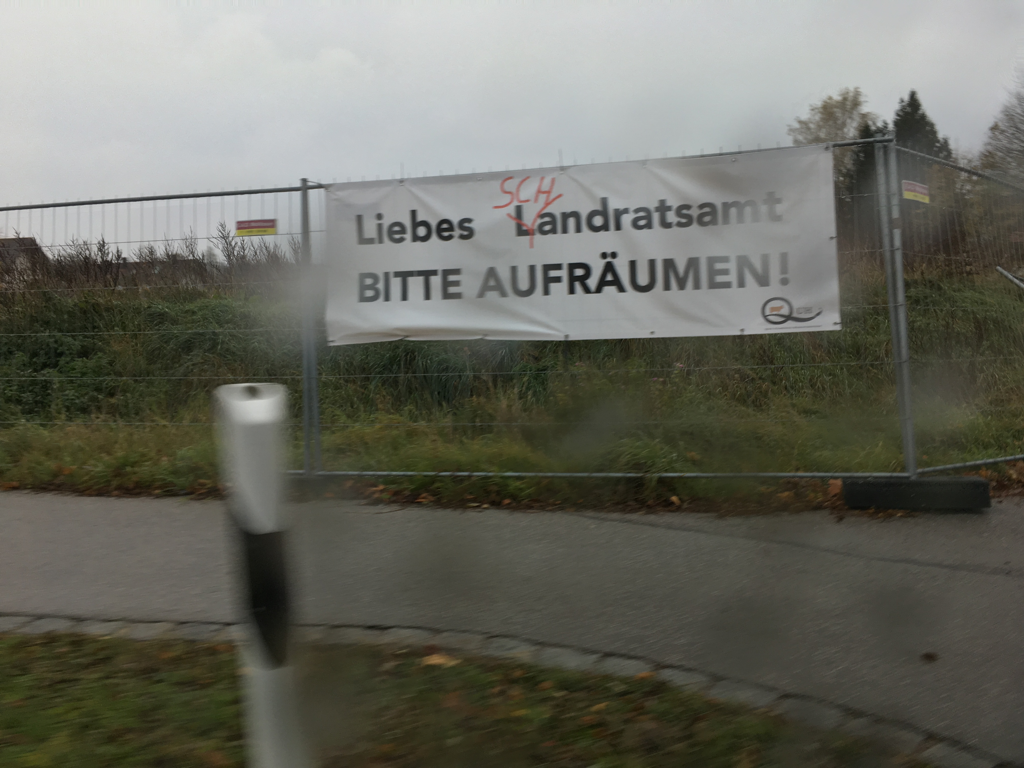 Manchmal muss es einfach sein. Da muss man aus ganzem Herzen “Danke!” sagen. Heute, am 4.11.2017 gilt unser ganzer Dank dem Landratsamt, das es – auf dem Tag genau – in nur einem Jahr und einem Tag intensiver Planungsarbeit geschafft hat, einen Bagger zum Schandfleck am Berger Huberfeld zu schicken.