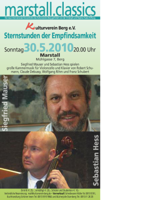 Sebastian Hess am Cello und am Klavier Prof. Dr. Siegfried Mauser, Präsident der Hochschule für Musik und Theater München, international arrivierter Pianist und Musikwissenschaftler, widmen sich am Sonntagabend der “empfindsamen Sinnlichkeit” – nach dem altbewährten Rezept der marstall.classics mit Werken aus unterschiedlichen Epochen. Wir hören den Romantiker Robert Schumann, Wolfgang Rihm als Komponisten der Moderne, den Impressionisten Claude Debussy sowie als Vertreter der Wiener Klassik Franz Schubert. Das Programm finden Sie hier.