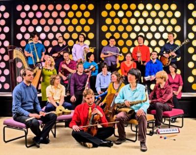 Andi Haberl (im gelben Hemd) mit dem “Andromeda Mega Express Orchestra”