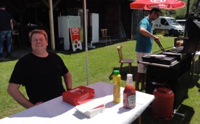 Strahlemann Errol freut sich über den einzigen Sitzplatz unter den Helfern, Gemeinderat Schmid legt Hand an die Würstel