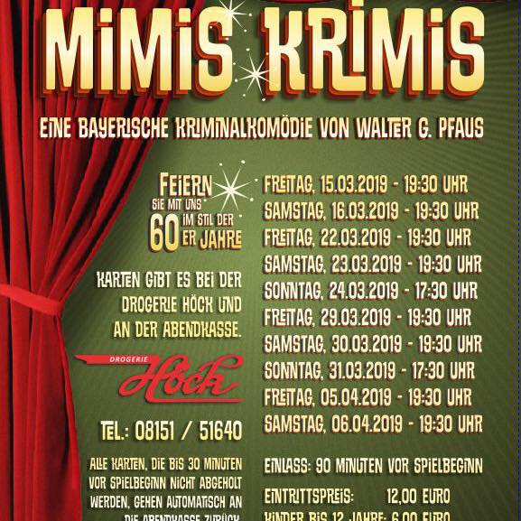 Die Premiere des Stückes “Mimis Krimis” findet am 15.3. in der Post in Aufkirchen statt. Das neue Bühnenbild “im Stil der 60iger Jahre”, das extra neu gebaut wurde, verspricht diesmal mehr als nur eine krachlederne Komödie. Die Schauspieler – allen voran unsere Lieblingsbedienung Hildegard Zahn in der Titelrolle der verbrechenssüchtigen Mimi – sind noch fleißig am Proben.