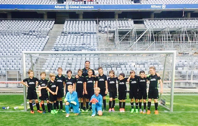 Was ist an diesem Bild verkehrt? – Richtig, das ist eine Auswahl aus den Jugendmannschaften des für seine Jugendarbeit (mit einigem Recht) bekannten MTV Berg … aber das ist nicht der Lohacker, auf dem die Jungs da stehen, sondern die Allianz Arena. – Hat der MTV Berg dem TSV 1860 etwa die Heimspielrechte dort abgekauft?