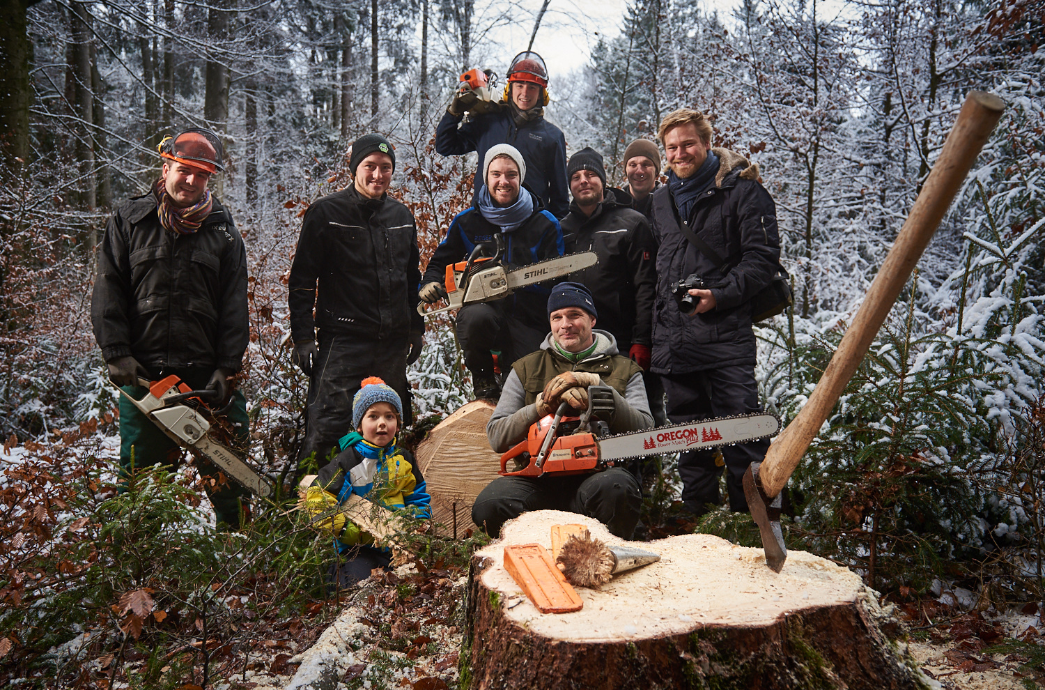 Die Allmannshauser Baumfäller/Burschen von links nach rechts: Phillipp Gämmerler, Alois Brunnhuber, Jonas Goerke, Moritz Gämmerler, Beni Bockhorni, Stefan Schwarz, Sebastian Holzbauer, im Vordergrund Mats Stiepel und Andi Quien (Foto: Kai Stiepel)