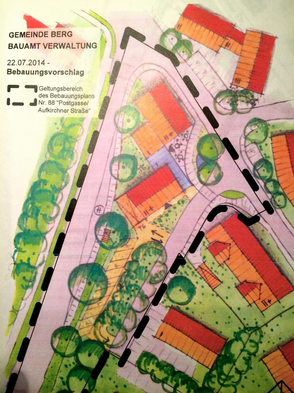 Außerdem stand noch ein weiteres Filetstück der Gemeinde auf der Tagesordnung: das Haus gegenüber der Apotheke in der Mitte von Berg steht leer, der Besitzer möchte auf seinem Grundstück neu, natürlich größer und mehrere Häuser bauen.