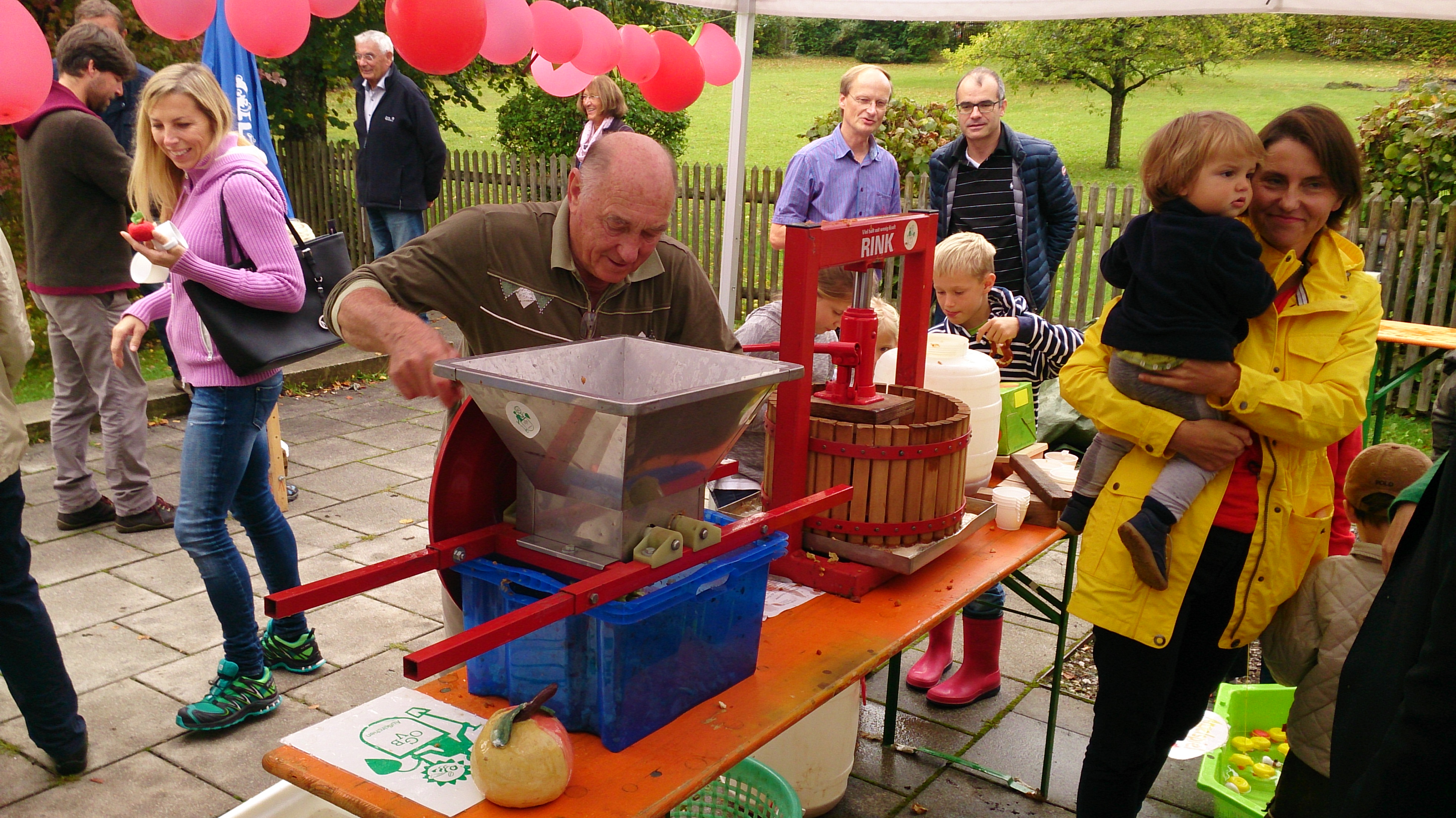 Der OGBV hatte die Äpfel für das Fest gespendet. Sie dienten in Körben als Deko, wurden aber auch gleich verarbeitet oder verputzt – oder in eingeweckter Form verkauft. An einer “Schmeckbar” gab es Kostproben unterschiedlich verarbeiteter Äpfel. Die Montessorischule Biberkor stellte rote Filzäpfel her, draußen demonstrierte Ralf Maier beim Schaumosten, das auf reges Interesse stieß, wie Saft und Most gemacht werden. Für die Kinder gab es allerhand Spiele, sogar mit musikalischer Untermalung. Dem neuen Pfarrer Albert Zott scheint es in seiner neuen Gemeinde auch gefallen zu haben.