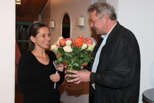 Die Kuratorin Katja Sebald durfte sich über einen Blumenstrauß freuen, nachdem sie die frohe Botschaft verkünden konnte: Das Kunstwerk des Monats wird auch 2016 fortgesetzt.