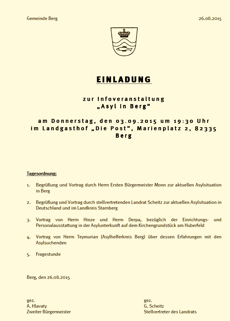 Soeben gab die Gemeinde Berg neue Informationen bekannt: Die Tagesordnung der Informationsveranstaltung mit Bürgermeister Rupert Monn, dem stellvertretenden Landrat Georg Scheitz und dem Organisator des Berger Helferkreises, Iradj Teymurian, steht nun fest. Genügend Raum für Fragen aus der Bürgerschaft ist vorgesehen.