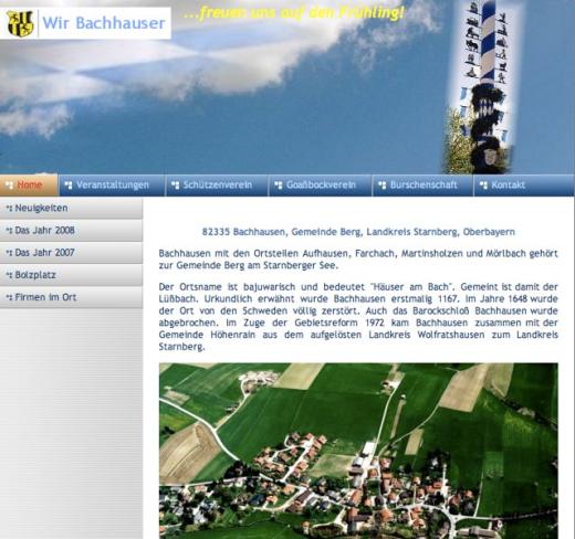 Die Internetseite von Bachhausen heißt: http://www.wir-bachhauser.de/. Wer sie anklickt, den grüßt ein animiertes, herzliches “Servus”. Wer weiterklickt, erfährt, dass sich die Bachhauser auf den Frühling freuen (ein Zeichen, dass die Seite aktuell und auf dem Laufenden ist). Wir sehen das folgende “Menü” mit örtlichen Vereinen, Veranstaltungen und den 3 örtlichen Betrieben. Untendran ein Luftbild und eine nette historische Einführung: