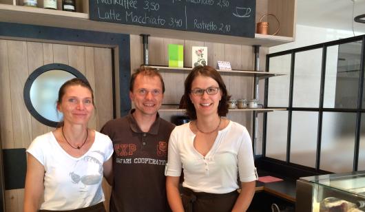 Hinter der Theke: Christiane Gastl-Pischetsrieder mit dem Wirtsehepaar Andreas und Barbara Gastl-Pischetsrieder
