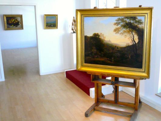 Die Ausstellung zur Galerieeröffnung besteht u.a. aus Werken von E.T. Compton, Alexander Koester, Fritz Bamberger und Franz Roubaud. Das Prachtstück ist die “Römische Herbstlandschaft” (1921) von Johann Georg von Dillis, die auf einer originalen Staffelei von Max Liebermann präsentiert wird.