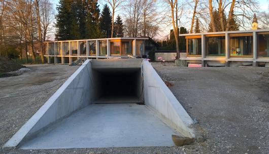 Gegenüber findet sich die kleine architektonische Sensation: das Haus, das nach einem Entwurf der Architekten Bembé/Dellinger oben Am Sonnenhof entsteht heißt schlicht “Einfamilienhaus mit Garage” und ist aber als Haus nur schwer zu erkennen. Es besteht aus einem rätselhaft an den Hang geschmiegten langgezogenen Ensemble von Fenstern (mit Tiefgarage), bei dem man nicht weiß, wie es zu bewohnen sein soll.