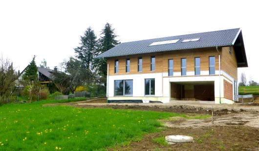 Das schönste Haus, das wir gefunden haben, entsteht in der Schmiedgasse in Aufkirchen. Statt der alten Schmiede wächst dort gerade ein Einfamilienhaus, dass zwar ultramodern mit schiefen Winkeln und überraschenden Perspektiven verblüfft, aber andererseits mit alten, verwitterten Hölzern verkleidet wird.