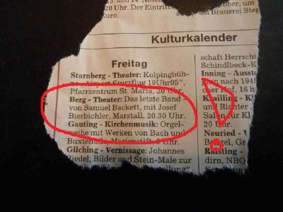 Dem SZ-Kultur(!)kalender sei dann noch ins Stammbuch geschrieben, dass der irische Nobelpreisträger Beckett und nicht Backett heißt. Und über den Unterschied im Informationsgehalt zwischen “verläßlichen” Printmedien und “unzuverlässigem” Internet reden wir dann ein anderes Mal.