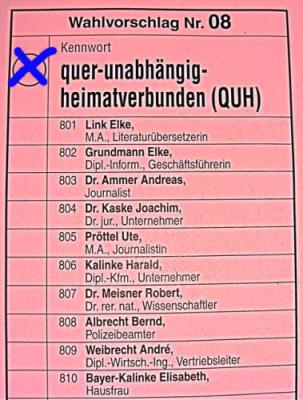 Und hoffentlich bringt uns der Wahlabend wirklich öfters als 3 mal 3 Stimmen für unsere Kandidaten. Täglich erreichen uns Anrufe und Mails, ob es denn genüge, bei Elke (oder besser allen beiden) 3 Kreuze zu machen. Natürlich nicht! Denn das hieße ja, anderen Parteien 17 Stimmen zu geben. Wir sagen es immer wieder: Am besten oben ein Kreuz für die QUH …