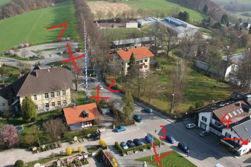 Dort wo der Maibaum steht (im Bild bei Nummer 2) möchte man gerne traditionell die Ortsmitte vermuten, allerdings ist dort kein Platz.