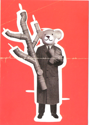 Das Plakat zur Ausstellung: Stoffbär Torwalzn, entfernt mit Bertel, dem Bildhauer, verwandt