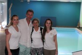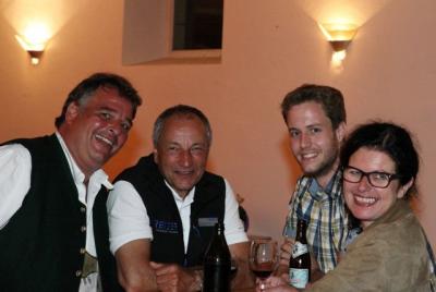 … hier bei der abschließenden Abendveranstaltung ausnahmsweise selbst links im Bild – mit dem Mitorganisator Wolfi Reiser, dem zukünftigen geschäftsführenden Beamten von Berg, Benni Bursic, und einer Dame, die ihren Namen nicht mehr genannt haben möchte. Mit Groß-Dank an den Keller Verlag!