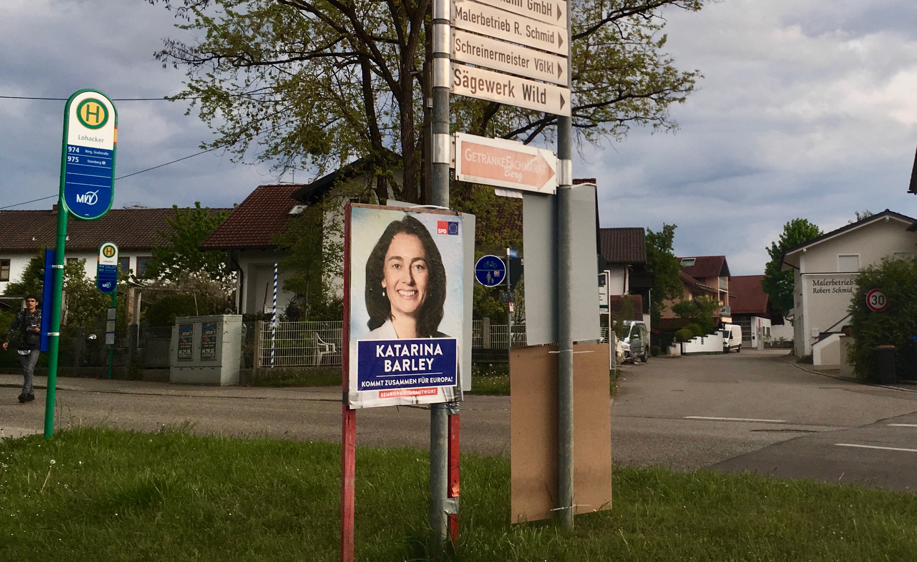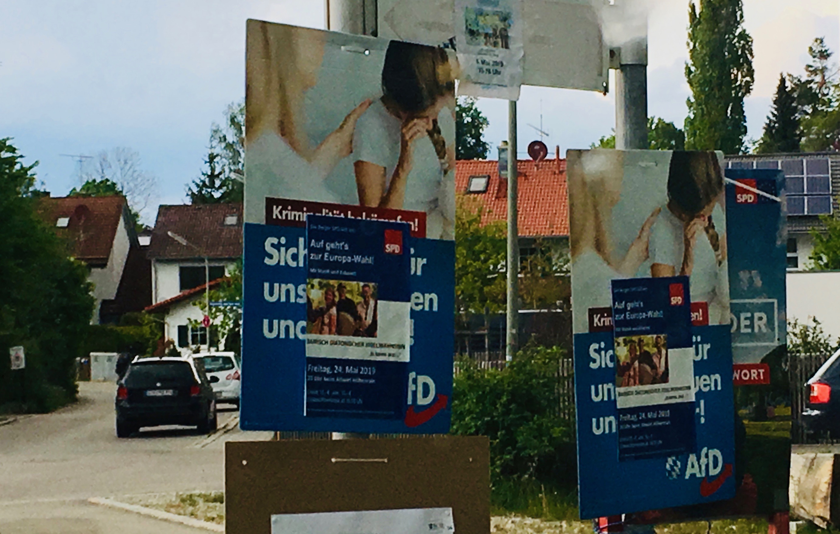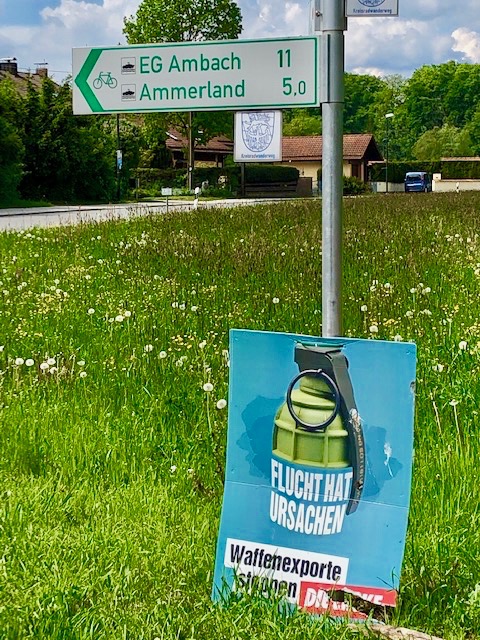 Auch die kleinen Parteien erhoffen sich bei der 5%-Hürden-freien Europawahl ein Mandat. Die Linke (dass es so etwas in Berg wirklich gibt?) will tapfer “Waffenexporte stoppen”, die ÖDP “Die Bienenretterin” nach Europa exportieren. Beider Plakate wirken an ihren Standorten allerdings etwas “herunter gekommen”.