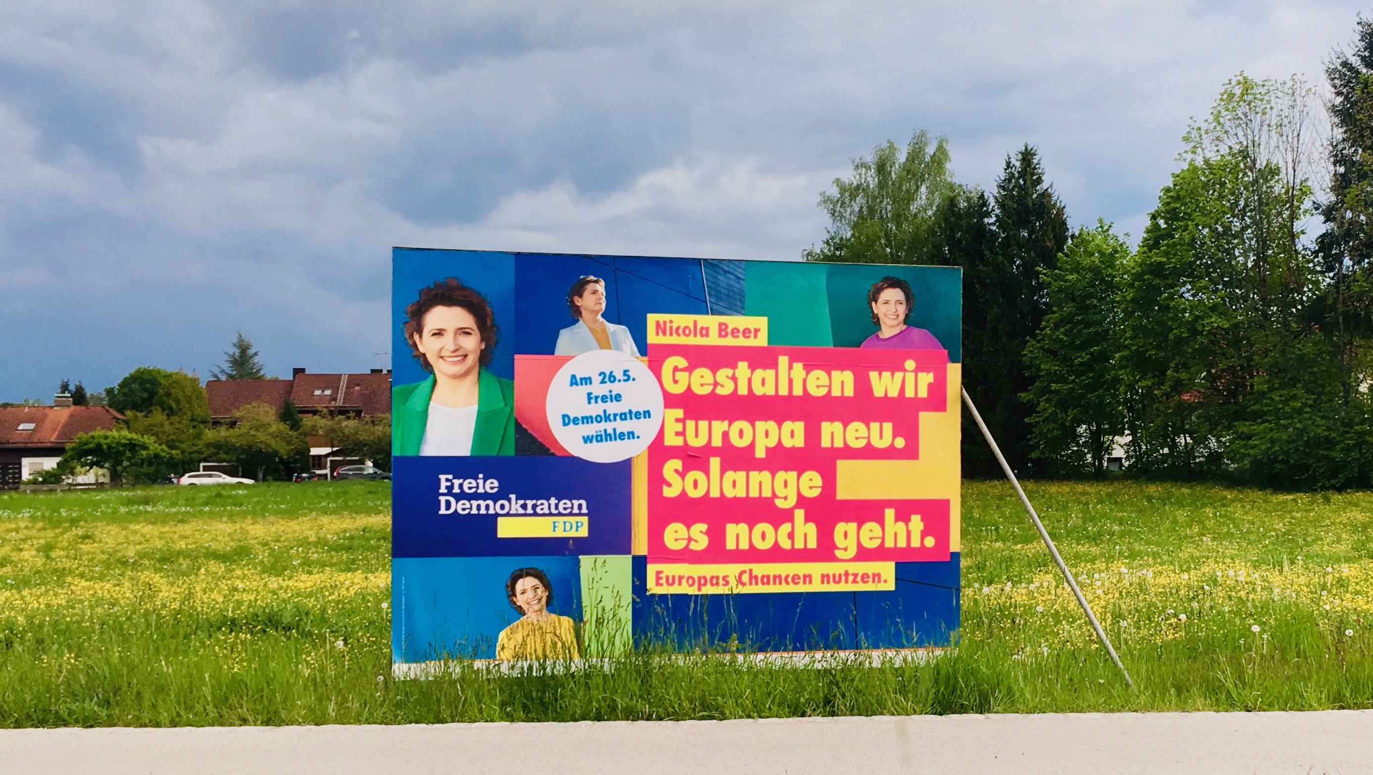 Auch plakativ traditionell stark vertreten ist in Berg die FDP. Die kleinste im Landtag vertretene Partei hat das mit Abstand größte Plakat im Gemeindegebiet aufgestellt (und die meisten vielleicht auch). Das große Plakat sieht zwar aus, als hätte sich die Werbeagentur nicht entscheiden können, welches der vielen kleinen Plakate sie nehmen soll, dafür erinnert es am Berger Kreisel daran, dass an diese Stelle nicht nur Europa, sondern bald auch das Berger Rathaus gestaltet werden muss: Allerdings nur “Solange es noch geht” … keine Ahnung, was uns dieser sinnfrei apokalyptische Slogan sagen soll. Ganz zu schweigen davon, dass vor dieser Wendung ein Komma und kein Punkt stehen müßte, da das Wort “solange” grammatikalisch eine “Konjunktion” ist, die Sätze verbindet. Zurück in die Grundschule.