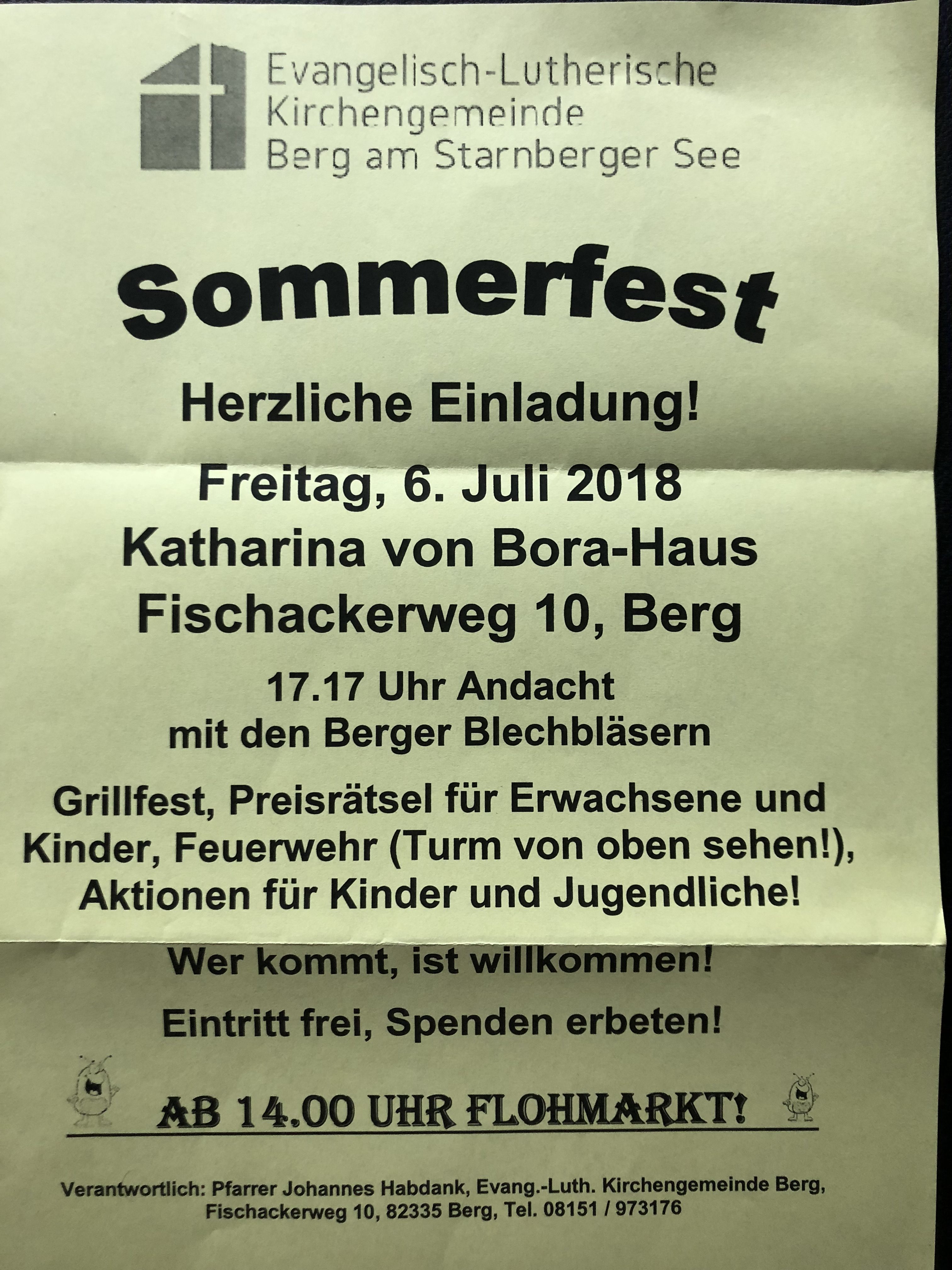 Mit dem schönen Satz “Wer kommt, ist willkommen” lädt die Evangelische Kirchengemeinde Berg heute zum Sommerfest. Besonders vielversprechend: Man kann den Glockenturm – und nicht nur den – von oben sehen – die Feuerwehr wird das ermöglichen.