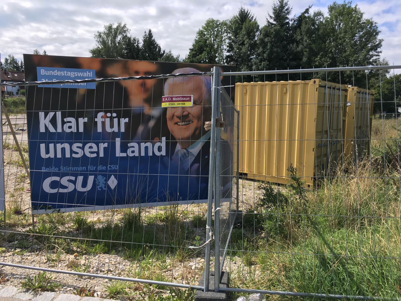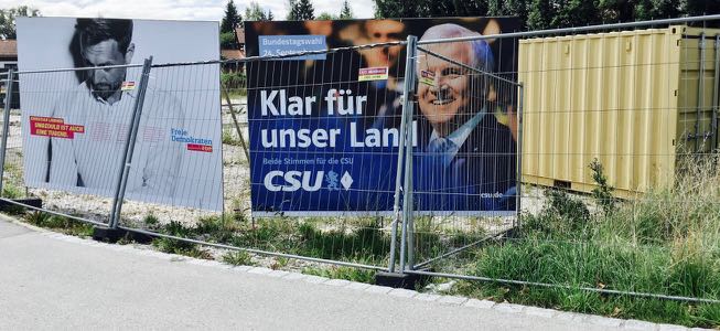 Fortsetzung unserer kleinen Serie über den Bundestagswahlkampf in Berg, der weiterhin seltsamste Blüten treibt. Denn während andernorts von einem Schwergewichts-Duell “Schulz, die Gerechtigkeit, vs. Merkel, das Beharren” geredet wird, kämpfen im Landkreis zwei politisch unerfahrene Bantamgewichtler um das Direktmandat (s.u.). Zudem sind die Spitzenkandidaten Schulz und Merkel in Berg noch nicht mal auf Plakaten zu sehen. Dafür auf den einzigen beiden Großplakaten der Gemeinde zwei Politiker, von denen der eine gar nicht zur Wahl steht und der andere beim letzten Mal nicht gewählt wurde; und was macht da der alte Toilettencontainer? – Nun er vereinigt die Eigenschaften der Politiker auf sich!