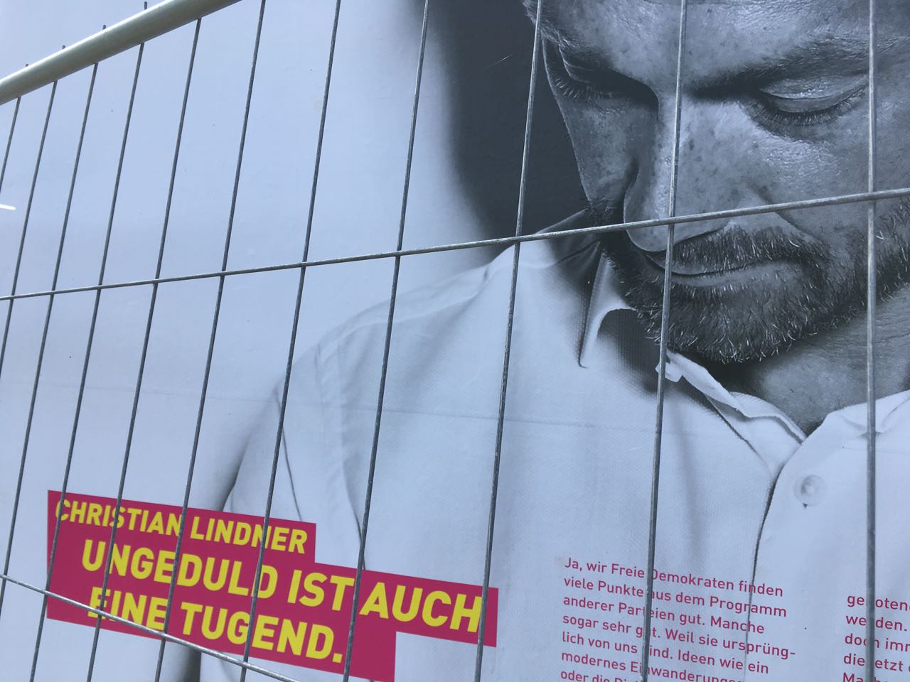Auf dem Plakat posiert mit provozierend offenem Kragen Christian Lindner, der schon deshalb ideal zur FDP paßt, weil er erst aus “Gewissensgründen” den Wehrdienst verweigerte, sich nach dem Zivildienst aus anderen Gründen allerdings zum Reserveoffizier bei der Luftwaffe ausbilden ließ. Diese Anpassungsfähigkeit der FDP wird auch optimal dadurch verdeutlicht, dass ihr Plakat auf den eloxierten Gitterzaun farblich optimal abgestimmt ist. Das könnte kein Chamäleon besser.