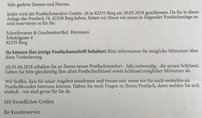 Inhalt des Briefes war die Ankündigung, dass ihr Postfach umziehen wird. Am 31.05. schließt der Postfachstandort in der Postfiliale im Buchladen ‘Schöner Lesen’ und zieht in die Schatzlgasse 4.